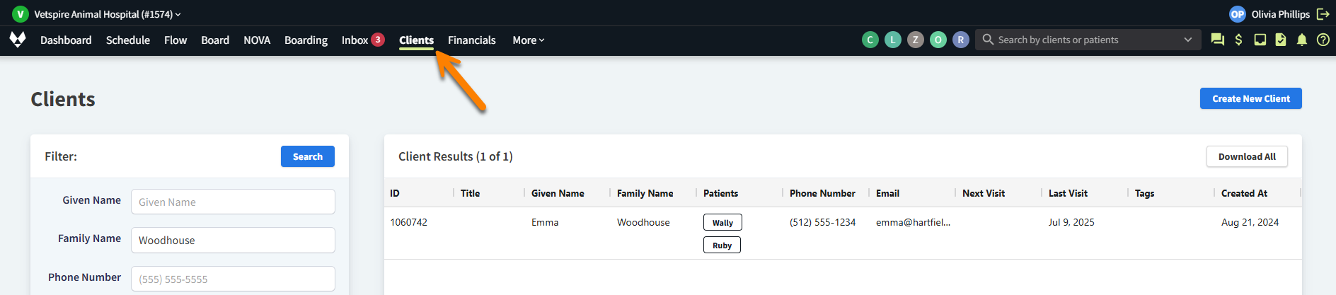 When you search for a client, the client’s associated patients display, along with any patients for which the client is the primary owner.