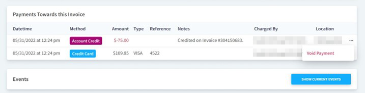 Click on the ellipses to the right of the account credit and select Void Payment.