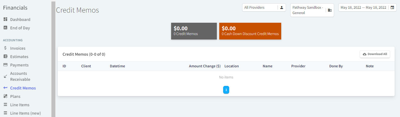Credit Memos - Lists all manual credits placed on an account during the date range selected. If a credit is used, the item will be removed.