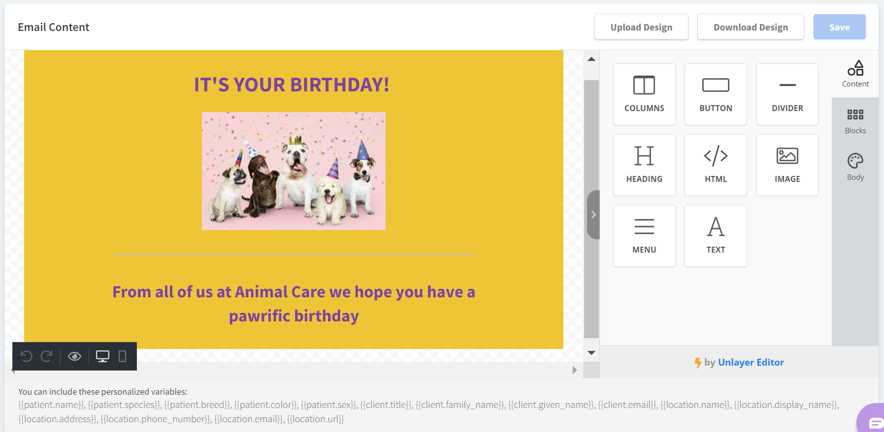 Use the Email Content editor to build and personalize your targeted message email body with text variables, images, calls-to-action, social media links, and more! You can also select Upload Design to load your own JSON design file in the editor.