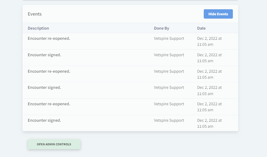 The Events (Change Log) shows who signed or reopened an encounter and other associated events.