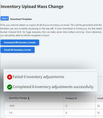 Once the stock count file is uploaded, a notification will indicate the numbers of Failed and Completed adjustments.