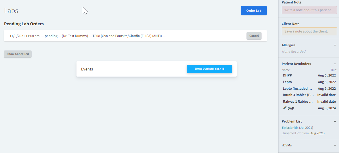 Pending Lab Orders are labs that haven’t run or have not been filtered into Vetspire through lab integrations. They can be canceled here to remove from the list using the Cancel button to the right of the test.