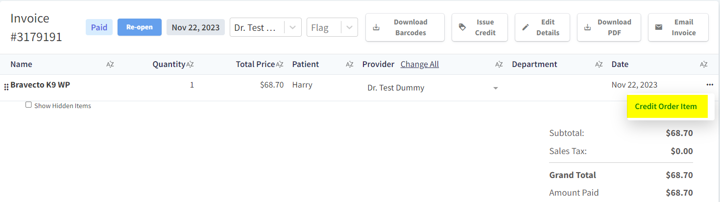 From Patient Chart > Billing, you can refund a line item on Paid invoices to add a credit to the client’s account and return units to your inventory stock counts.