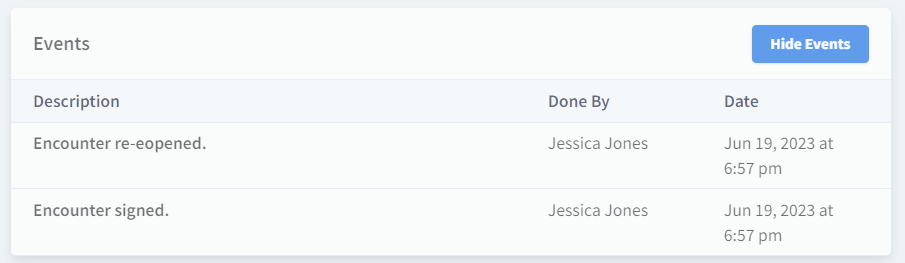 Located at the bottom of each Encounter, above the Footer, there is a Current Events log which will be stamped with the date, time, and user each time an encounter is signed and re-opened.